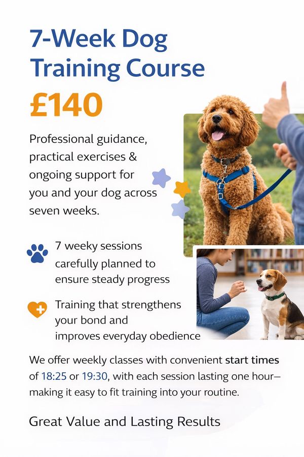 The cost of our 7-week dog training course is £140, offering excellent value for a structured and comprehensive programme designed to support both you and your dog. Across the 7-weeks, you’ll receive professional guidance, practical training exercises, and ongoing support to help build strong foundations and lasting results.